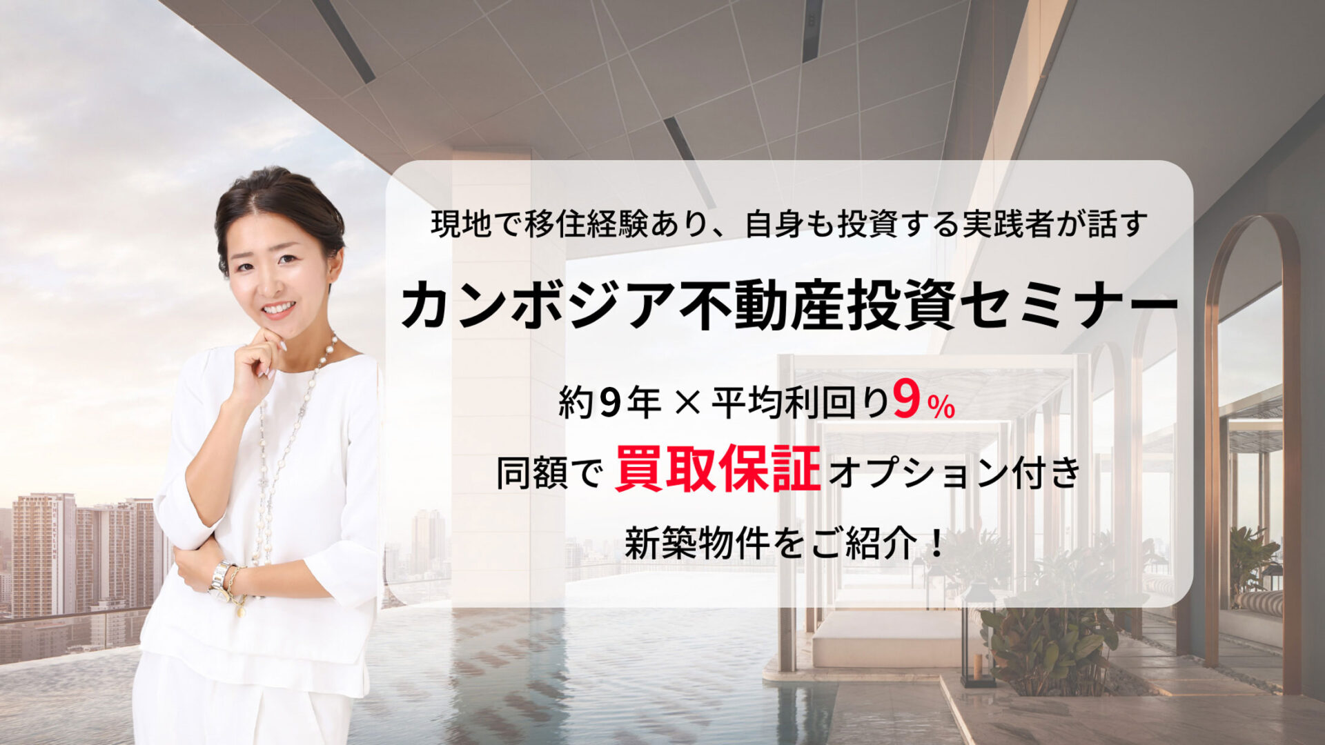 | セミナー内容 | ・海外不動産を持つ理由 ・カンボジア不動産の現状と今後について ・カンボジア銀行口座開設のご案内 ・開発会社について ・物件について ・特典 ・質疑応答 |