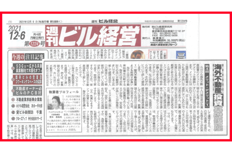 週刊ビル経営 第1224号に掲載されました 投稿日 2021年12月6日 公開日: 2021/12/06 週刊ビル経営の第1224号に掲載されました。 海外不動産投資基礎講座 「第4回 メリット・デメリット(1)」 代表荒木の連載コラムになります。 是非ご覧ください。 ▶︎週刊ビル経営 不動産市況から経営ノウハウまでビル経営の情報メディア 一覧に戻る 記事をシェア: