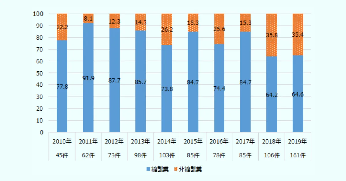 非縫製業では容器包装・プラスチック・精米・電化製品などが主流でしたが、2018年以降は非縫製業の割合が急増しており、投資分野も変化してきています。