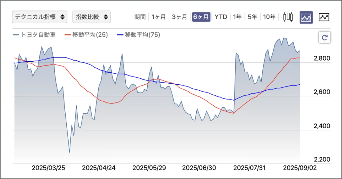 以下のチャートが示すように、トヨタの株価は対米の関税交渉によって、大きく変動しています。